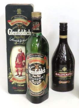 A bottle of Glenfiddich Special Old Reserve single malt whisky twinned with a bottle of Ballycastle Country Cream