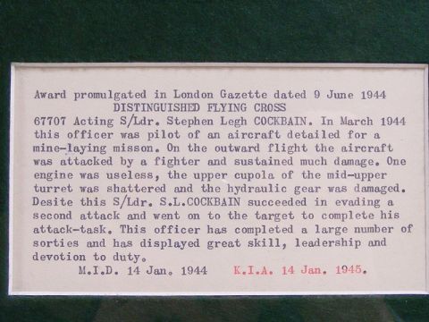 67707 Acting Squadron Leader Stephen L. Cockbain WW2 Medal Set - DFC - Distinguished Flying Cross, includes log book & other related ephemera. Presented Within Quality Mount & Frame