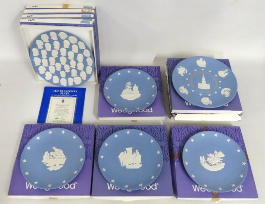 A quantity of eleven boxed Wedgwood jasperware plates relating to the USA comprising Presidents Plate (5), Independence Bicentennial (3), Paul Revere's "Ride", Declaration Signed & the Boston Tea Party