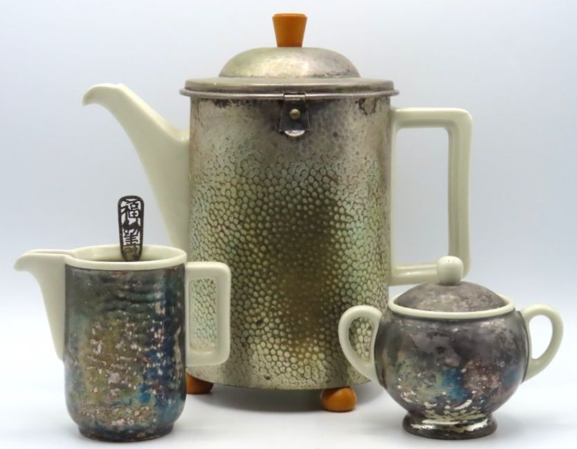 An art deco WMF coffee set with Bakelite fittings to coffee pot which measures 235mm tall, twinned with a Chinese white metal spoon, maker HC, possibly Hung Chong, 13.2g