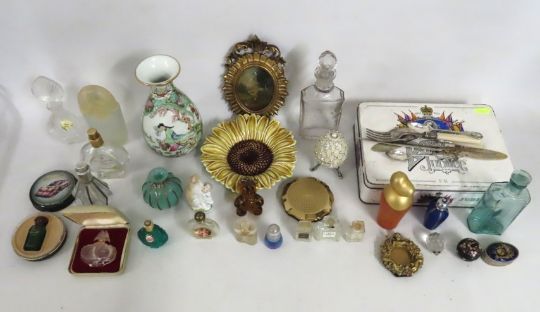 A collection of various scent bottles, a small reproduction oil painting, a modern Chinese vase, a majolica style sunflower dish & other items