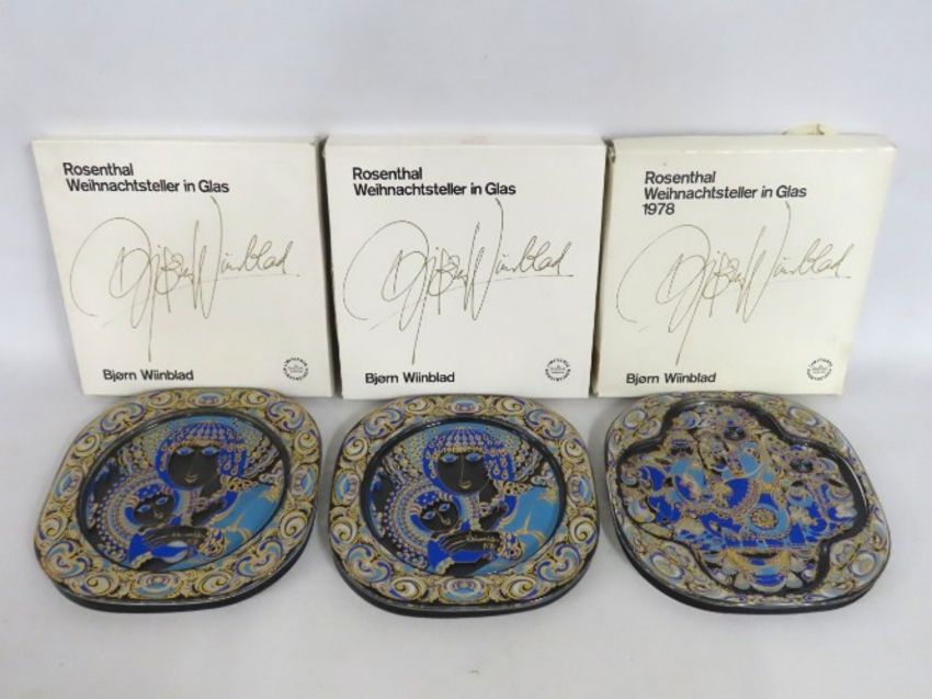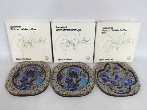 A boxed quantity of three decorative Rosenthal art glass Christmas plates signed & dated by Bjorn Wiinblad (Danish 1918-2006), 1976 (2) & 1978 (1)