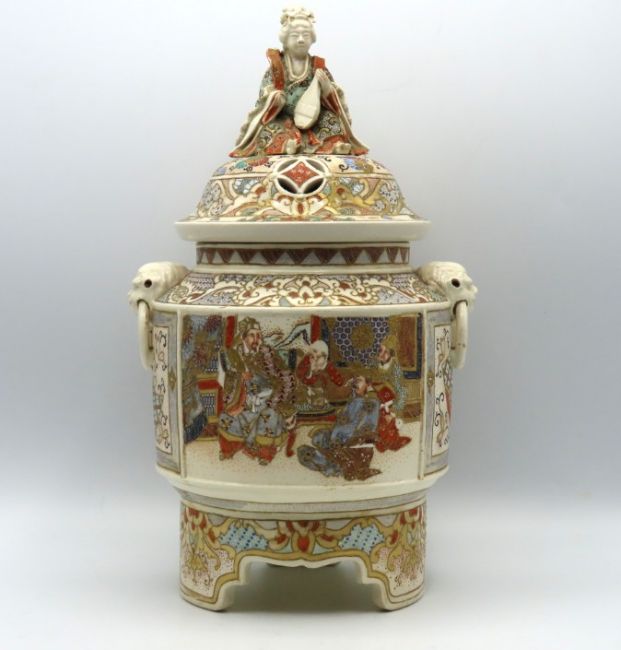 A Meiji period Japanese Satsuma ware kōro incense burner, small loss to top of figure's mandolin, 310mm tall