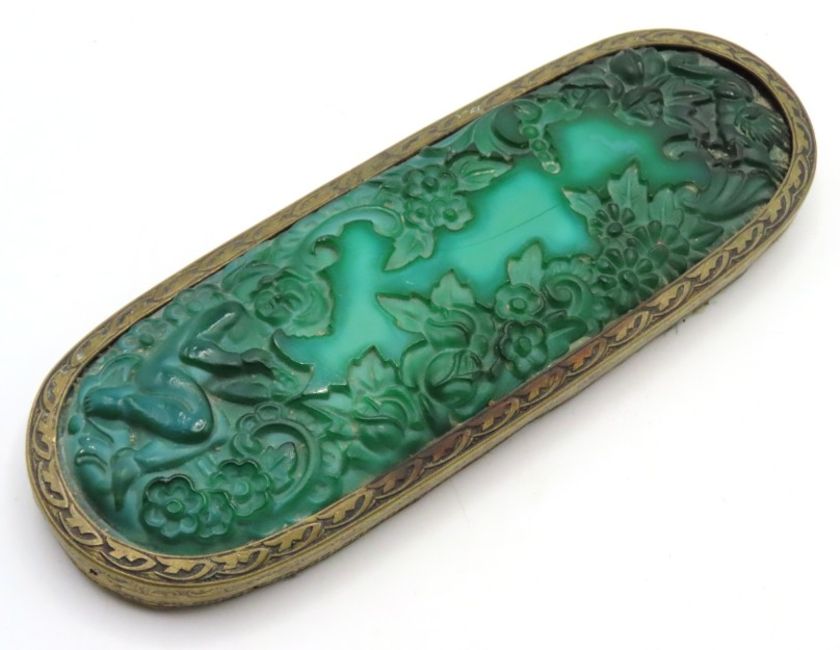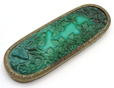 An art deco malachite glass brush top, later converted to be a paperweight, 165mm wide