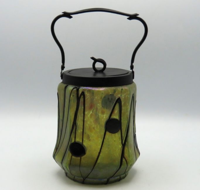 A c.1900 Loetz style iridescent blown glass biscuit barrel with shades of green & black in art nouveau styling, the plated parts later painted black, appears easy to remove, 245mm tall inclusive