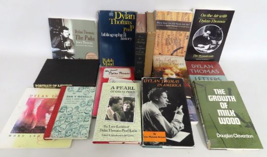 A selection of books relating to Dylan Thomas including "Under Milk Wood" in Welsh