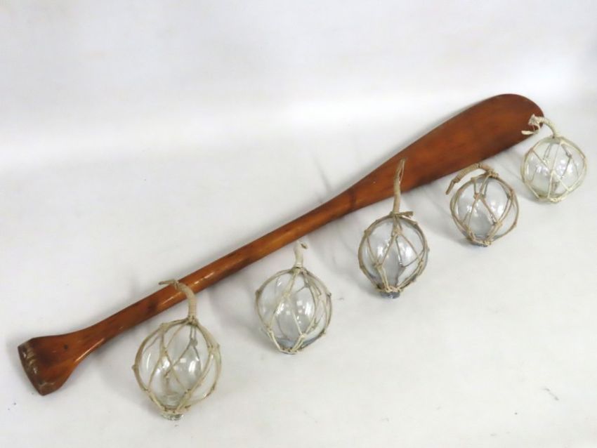 A wooden paddle 1050mm long, twinned with five glass floats