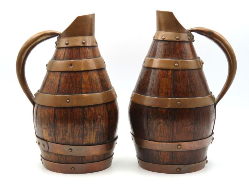 A pair of antique French coopered oak wine jugs, 228mm tall