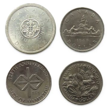 An 0.800 silver Canadian dollar, Charlottetown, Quebec, 23.3g, twinned with three other Canadian coins comprising a 1968 Hamilton $1, a 1970 Manitoba dollar & a 1971 Voyageur dollar