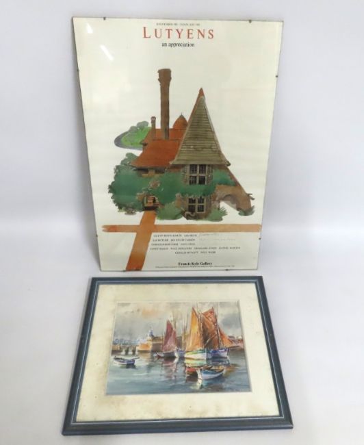 A mounted Lutyens exhibition poster twinned with a watercolour of yachts in harbour signed Annod & titled "At Concarneau", image size 290mm x 215mm