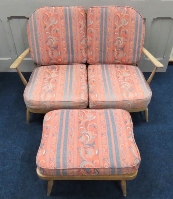 A vintage Ercol four piece suite comprising a two seater sofa, two arm chairs & a foot stool, webbing & cushions would need replacing. The loose cushions may not comply with the Furniture and Furnishings (Fire) Safety Regulations 1988 and for this reason it should not be used in a private household dwelling