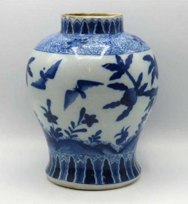 A 19thC. Chinese blue & white jar lacking cover decorated with bats & foliage, 238mm tall