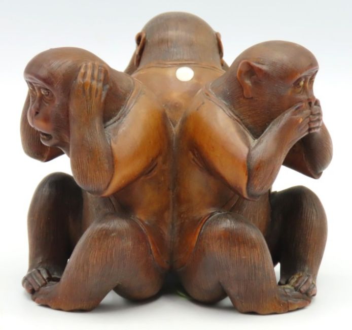 A Meiji period well carved Japanese "Three Wise Monkeys" figure group, Mizaru, Kikazaru, and Iwazaru, "speak no evil, see no evil, hear no evil", 75mm tall x 95mm wide, loss of one ivory insert & signatories ivory insert. Ivory reference submission: EEUX75NG