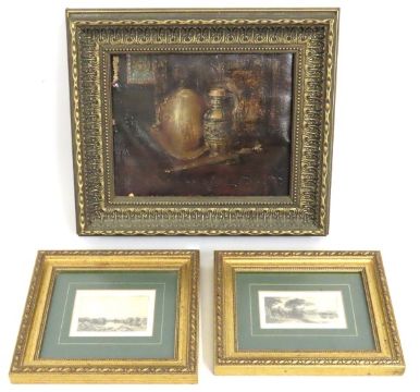 A 19thC. gilt framed interior continental oil on canvas still life, possibly Austrian school, depicting stoneware bottle, a soldiers helmet & dagger on table, image size 218mm x 175mm, twinned with two framed 18th/19thC. miniature pencil sketches of landscape
