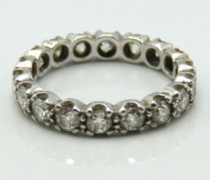 A 1920s white metal eternity ring set with approx. 1.8ct of old cut diamond, tests electronically as platinum, 4.6g, size P