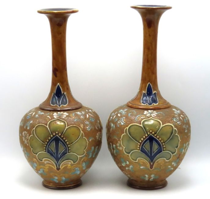 A pair of Royal Doulton stoneware vases, one a/f, 385mm tall