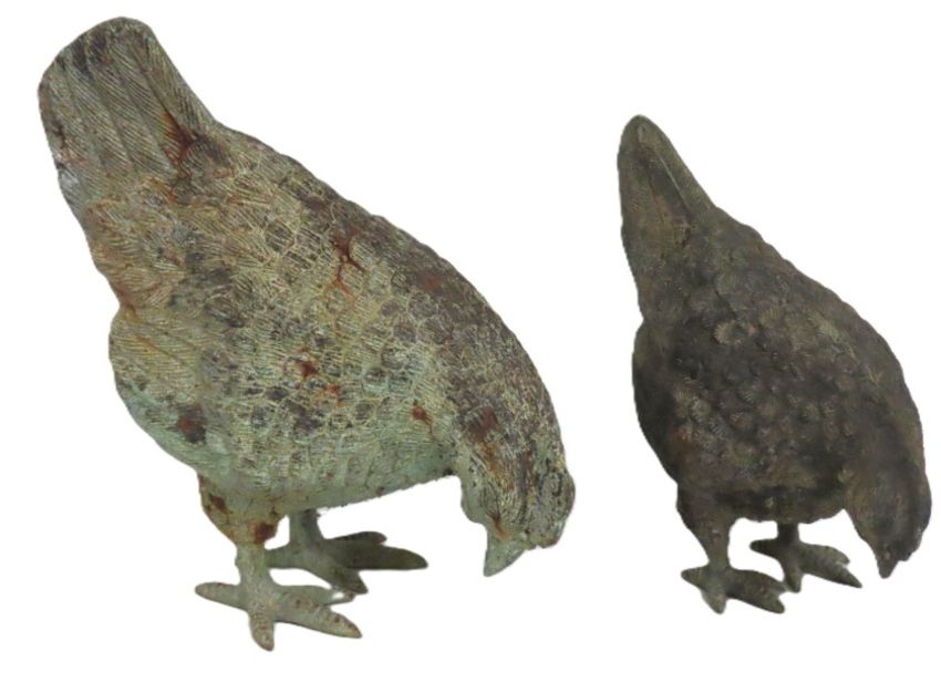Two bronze finish style garden chicken ornaments, tallest 210mm