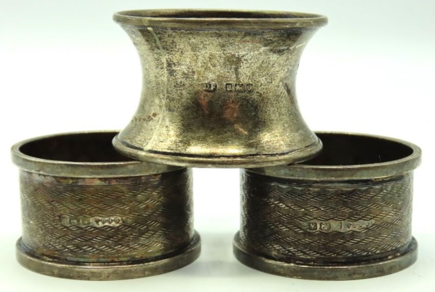 A pair of 1925 Birmingham silver napkin rings by H. Bros twinned with one 1915 London silver napkin ring by Josiah Williams & Co. (David Fullerton), 73.8g