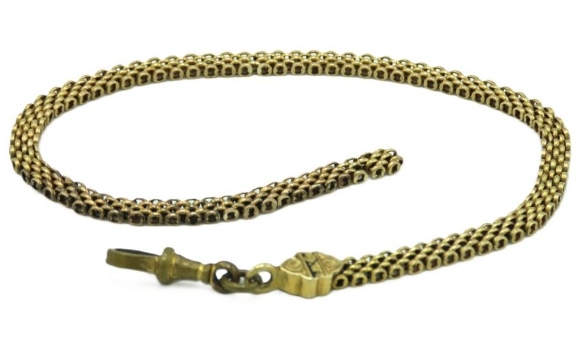 An antique yellow metal chain with enamelled detail to end fitted with brass clip, a/f, yellow metal tests electronically as 9ct gold, gold weight approx. 8.3g