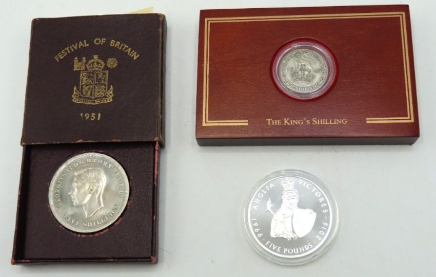 A 0.720 silver Wilhelmina 2 1/2 gulden twinned with a 1945 0.500 silver shilling, 1951 Festival of Britain crown & a 2016 commemorative £5 coin