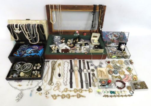 A quantity of costume jewellery items including designers Jenny Packham, Anne Klein, Jon Richard, & to include watches, brooches, bracelets & plated chains