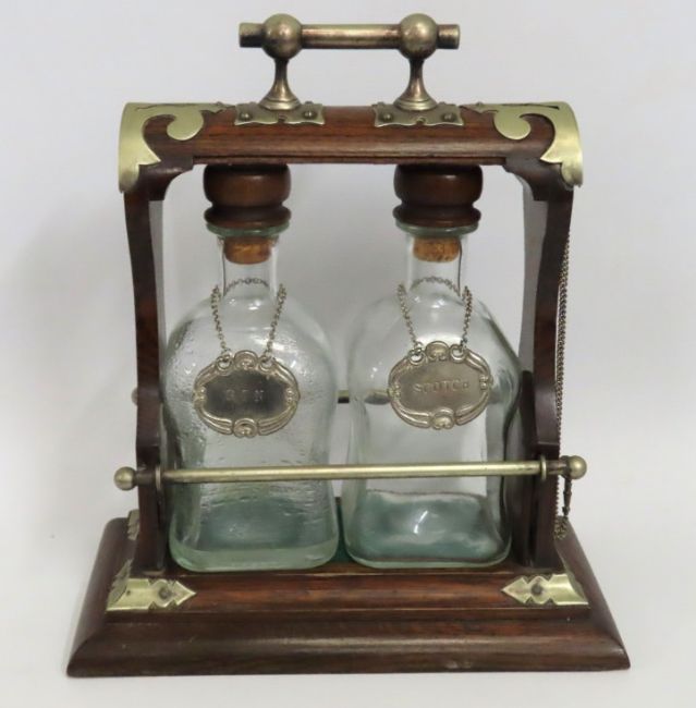 An antique oak & brass Tantalus with plated gin & scotch labels, 345mm high