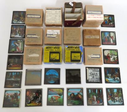 A collection of coloured & black & white lantern slides including Disney, Cinderella, Three Little Pigs, Peter Pan, Man in the Moon, some blanks, 130 total