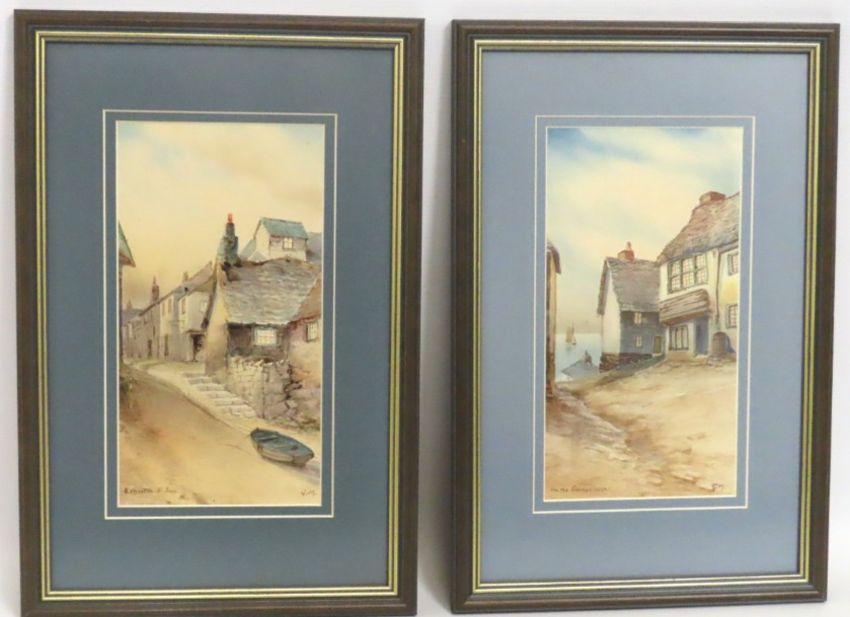 A pair of framed watercolours depicting Cornish street scenes titled "A Street in St. Ives" & "On the Cornish Coast", image sizes 269mm x 141mm, monogrammed G. M.