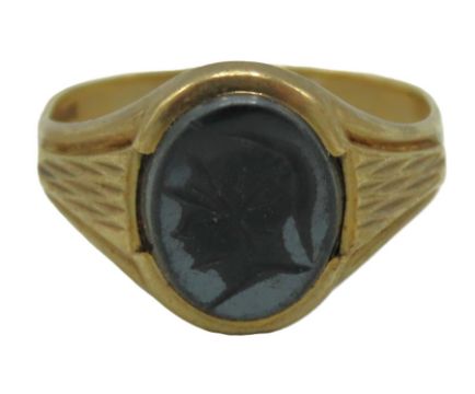 A 9ct gold signet ring set with hematite with carved centurion, 3.6g, size S