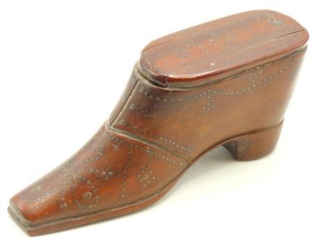 A 19thC. mahogany treen novelty boot snuff box, 115mm wide