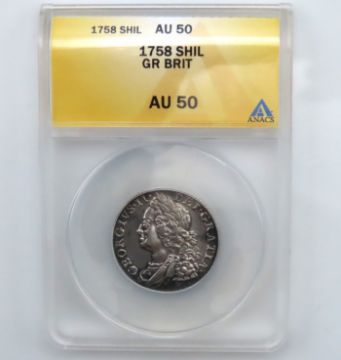 A graded 1758 George II silver shilling, grade AU50