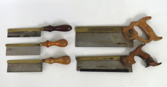 Five hand saws with brass spines including Tyzack Sons & Turner Ltd. no. 120, largest 375mm wide
