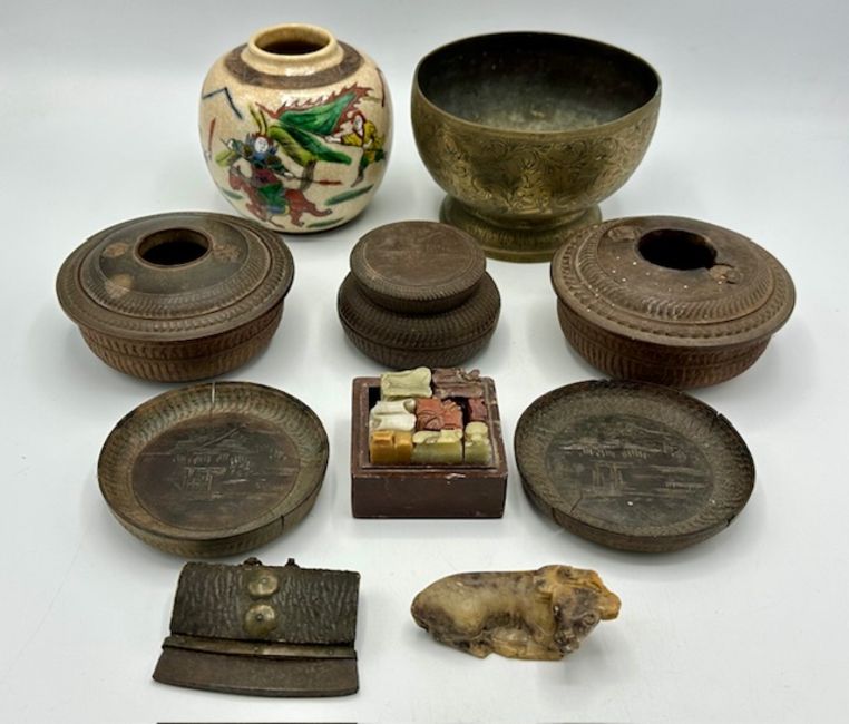 A selection of Chinese items to include three wooden bowls & two carved dishes, a Chinese flint purse, a Chinese carved soapstone seal box, lacking lid, a carved soapstone oxen, a 19thC. Chinese crackle glaze ginger jar lacking lid & a 19thC. Tibetan brass bowl with chased decor, bowl 133mm diameter x 89mm high. Provenance: The family member who acquired these items was Major Frederick William Birch of the Sikh Guards. He was based in Peking at the time of the Boxer Rebellion c.1900. These items were removed from the "Winter Palace" area, Peking & then was auctioned within the services. Major Birch was born in Bengal 1869 & died in Basra, 1916. His name is on the memorial there & the memorial in the church at Shaldon, Teignmouth