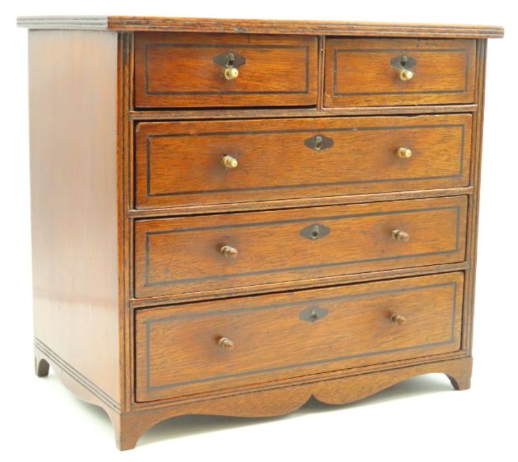 A 19thC. mahogany apprentice piece chest of drawers, four of which have ivory handles, 281mm wide x 254mm high x 172mm deep. Ivory exemption number: JD4WK2EP